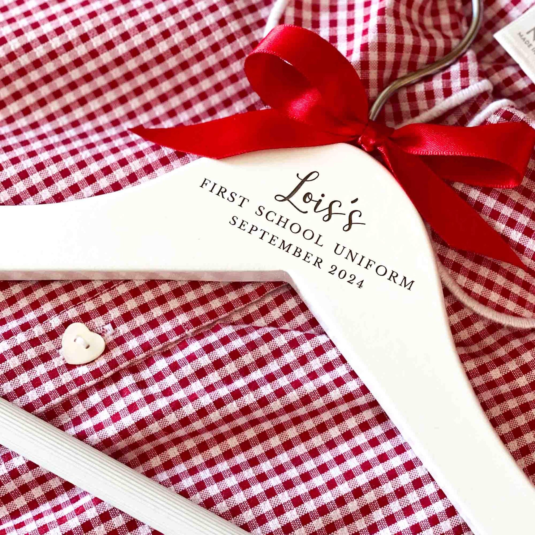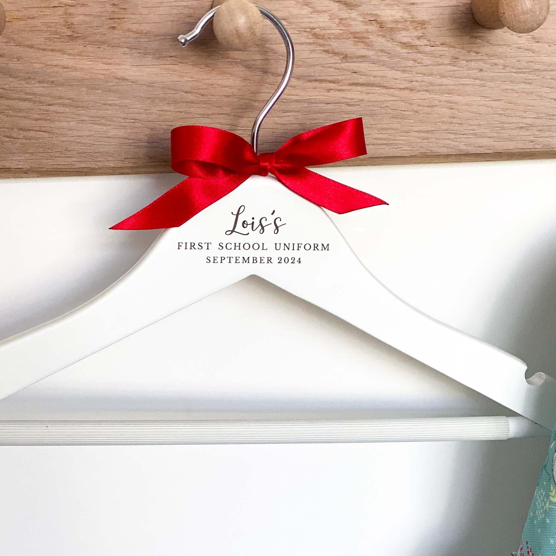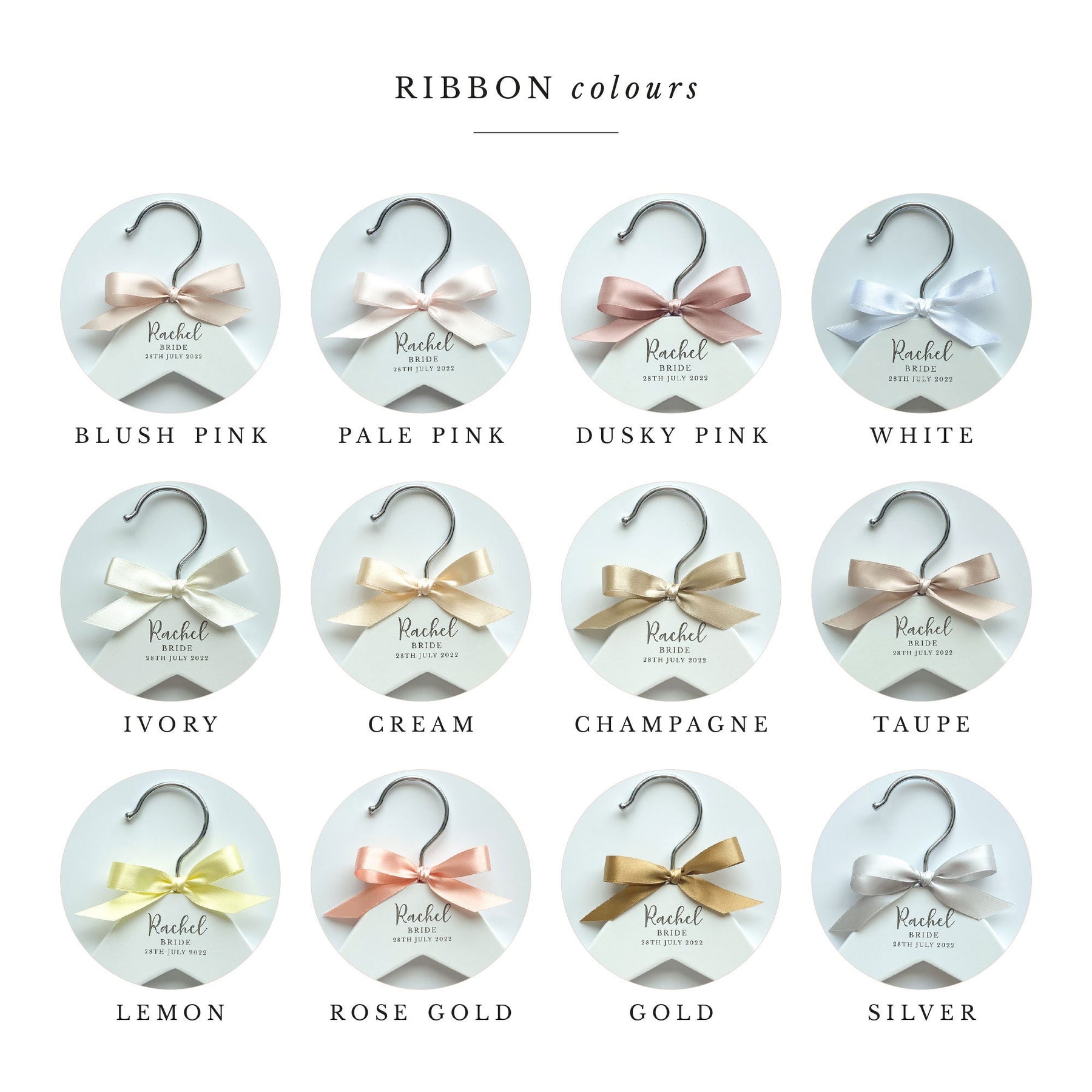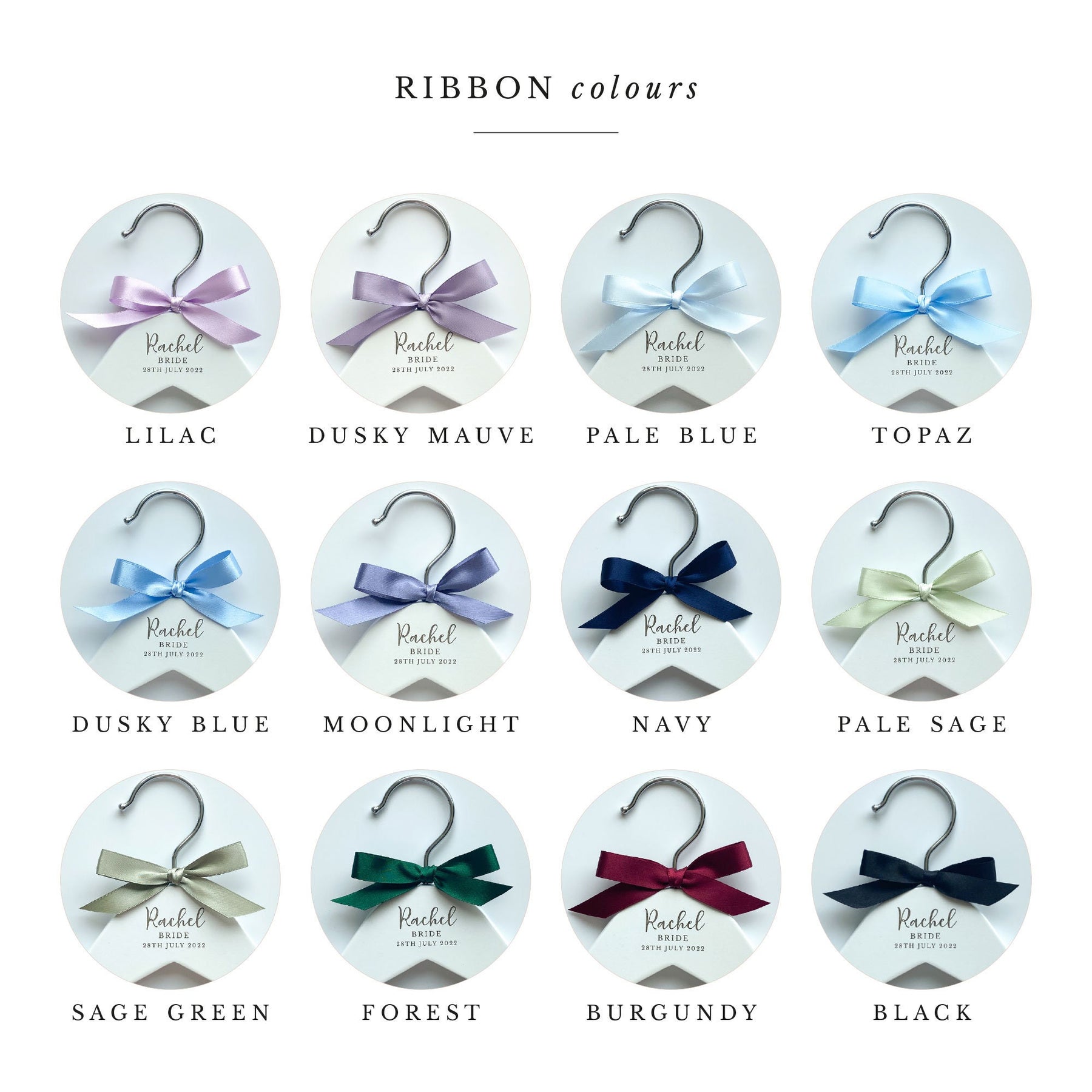Please note that the colour of the text on the hangers cannot be changed as it is laser engraved into the wood. However, you can choose the colour of the bow from the options displayed in the thumbnail images.