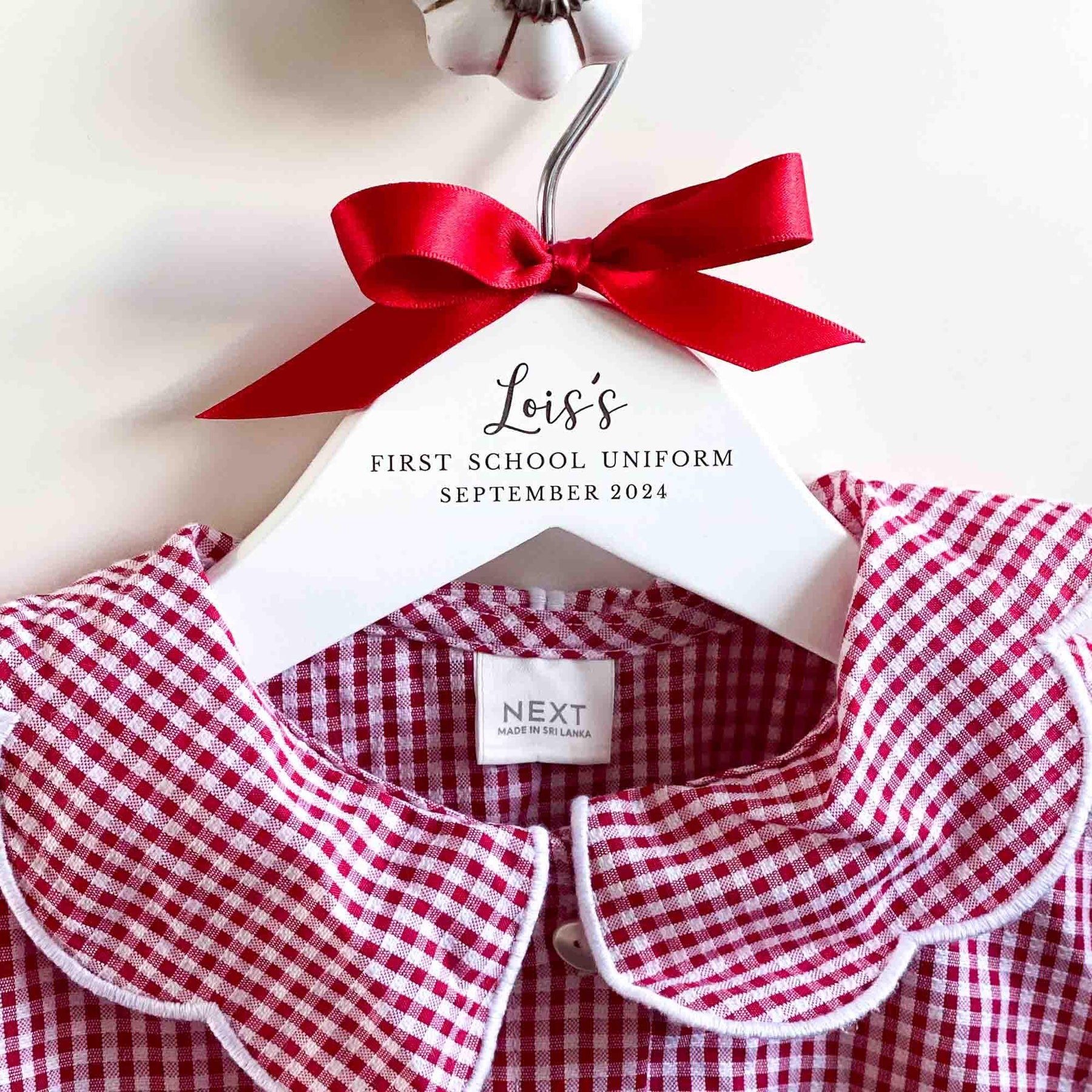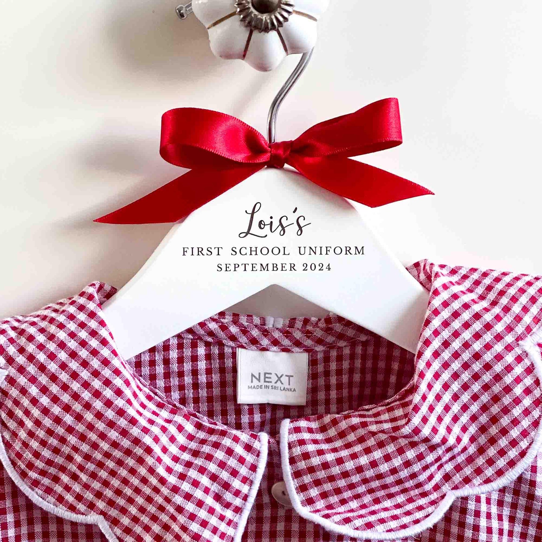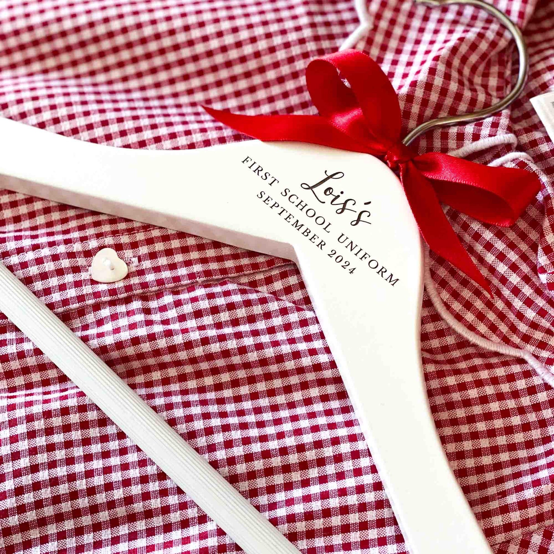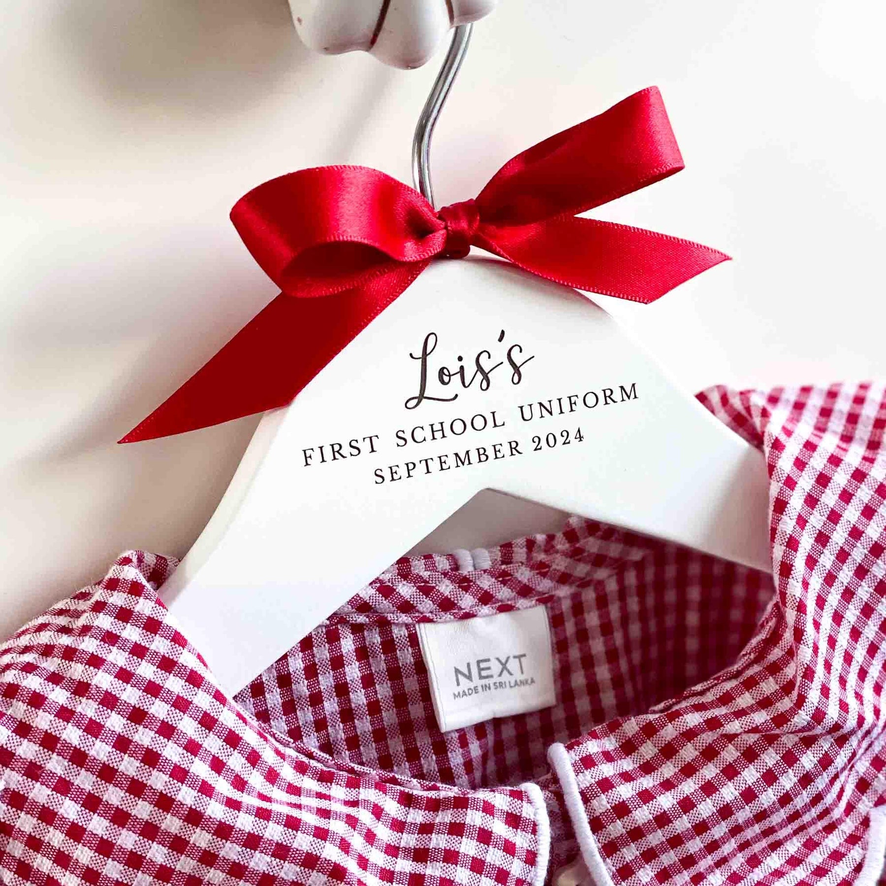 Please note that the colour of the text on the hangers cannot be changed as it is laser engraved into the wood. However, you can choose the colour of the bow from the options displayed in the thumbnail images.