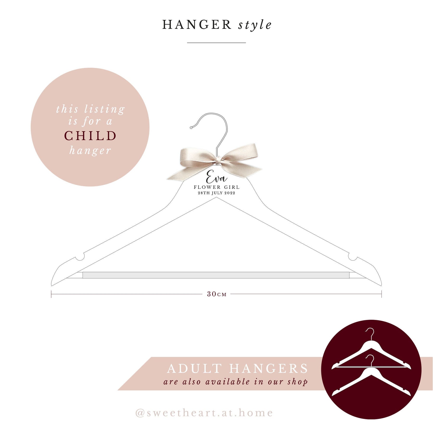 The dimensions of the adult hangers are 40cm wide, while the child hangers are 30cm wide, making them perfect for young flower girls and page boys. Please note that the child hangers have a separate listing.