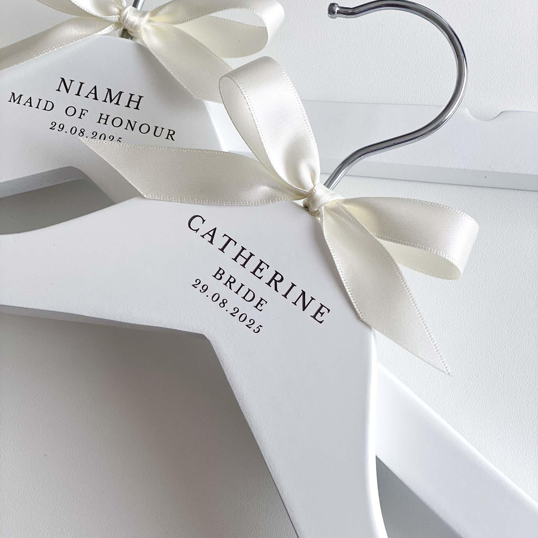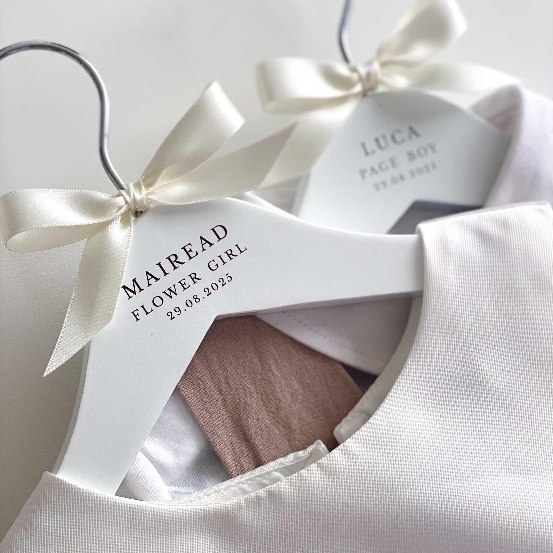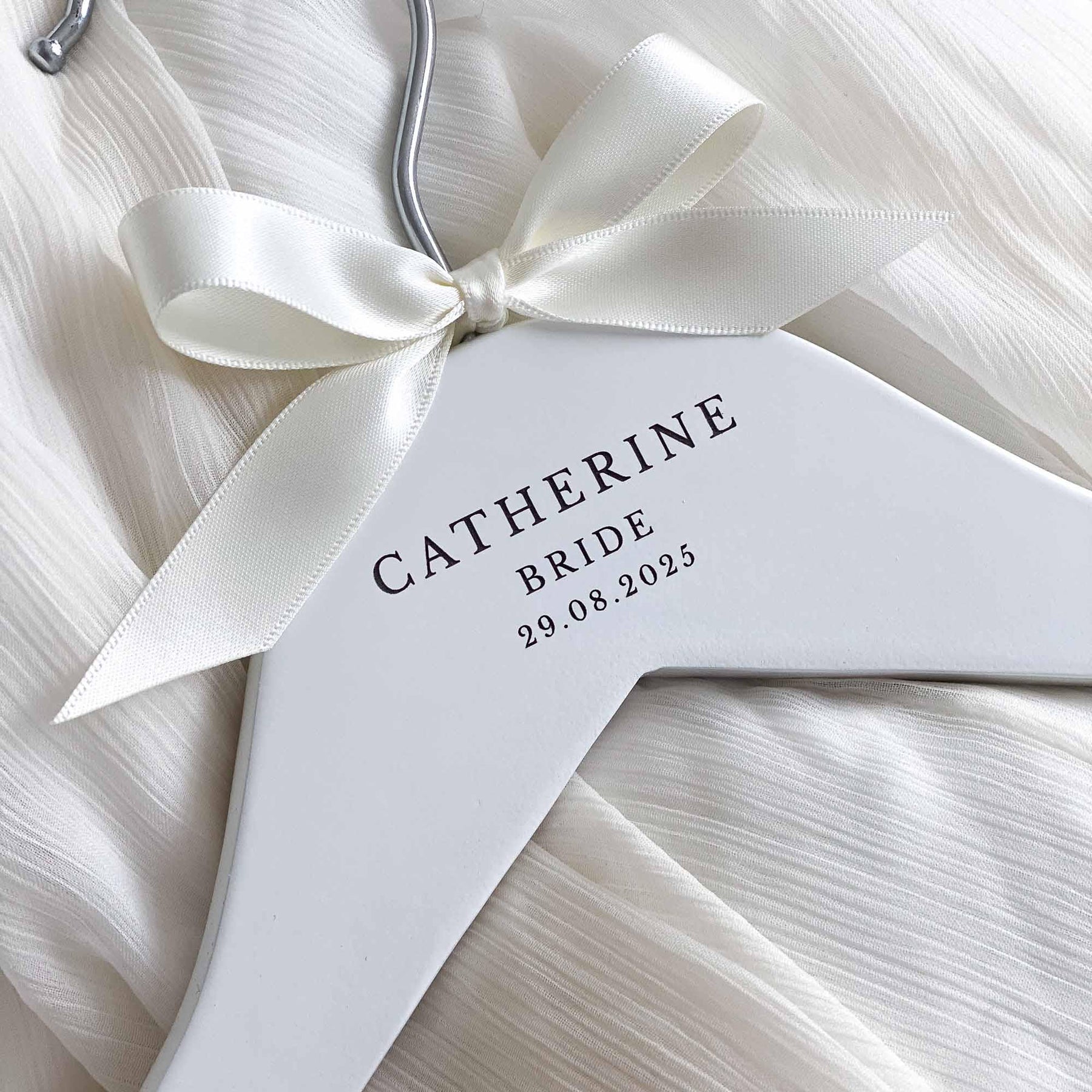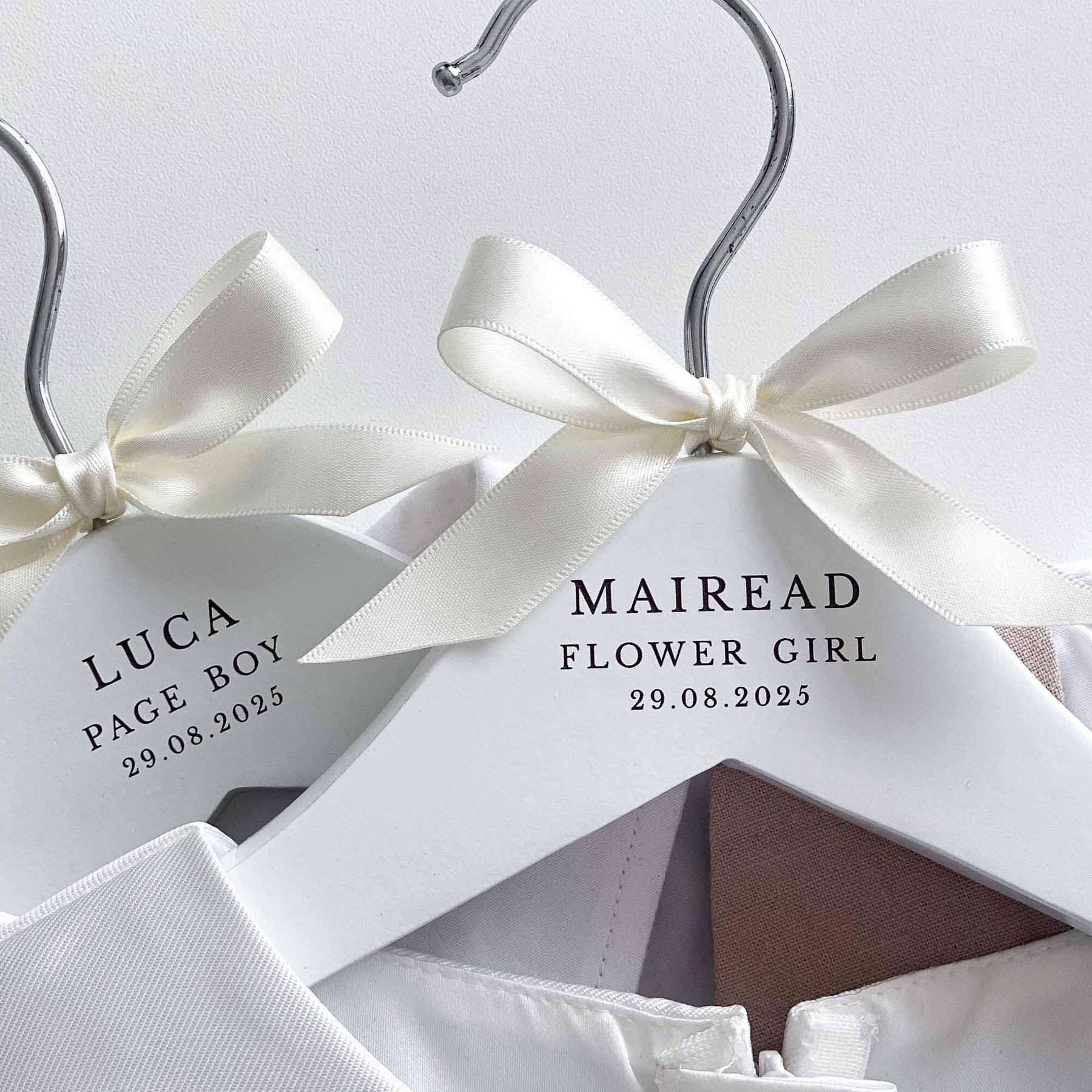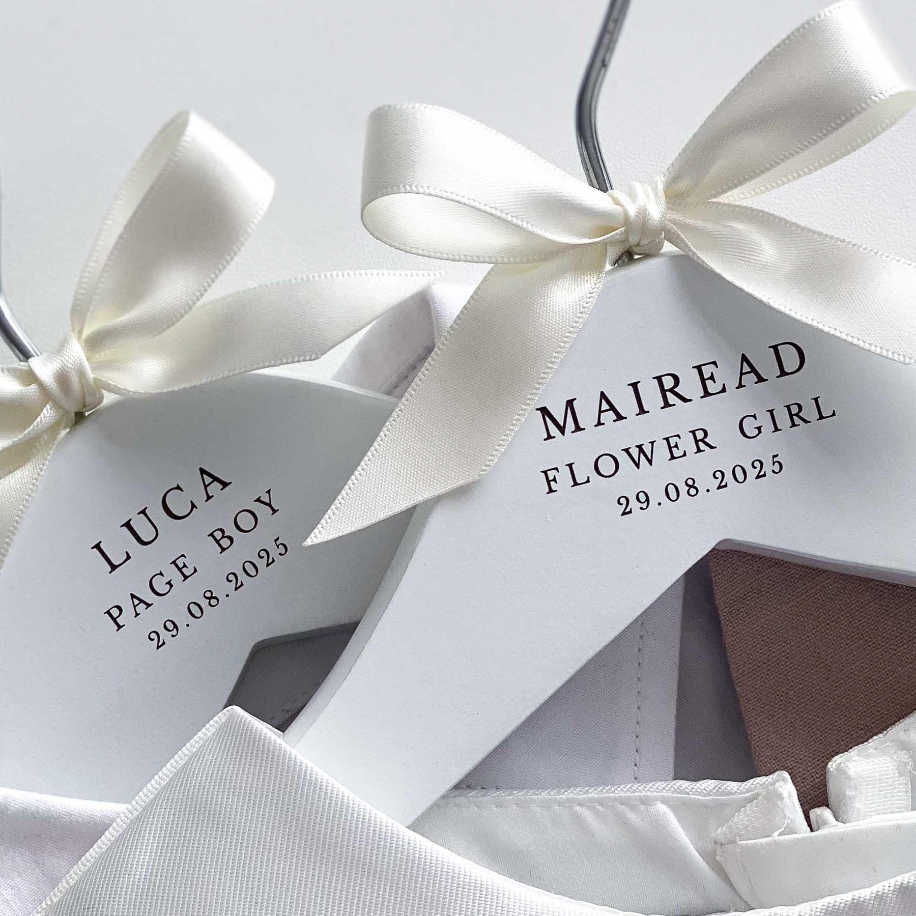 The hangers are hand-finished with a satin bow, adding a touch of sophistication and elegance. You can choose from a range of ribbon colours to suit your preferences and wedding theme. If your desired colour is not listed, simply select the "Other" option and specify your preferred colour in the personalisation or notes box.