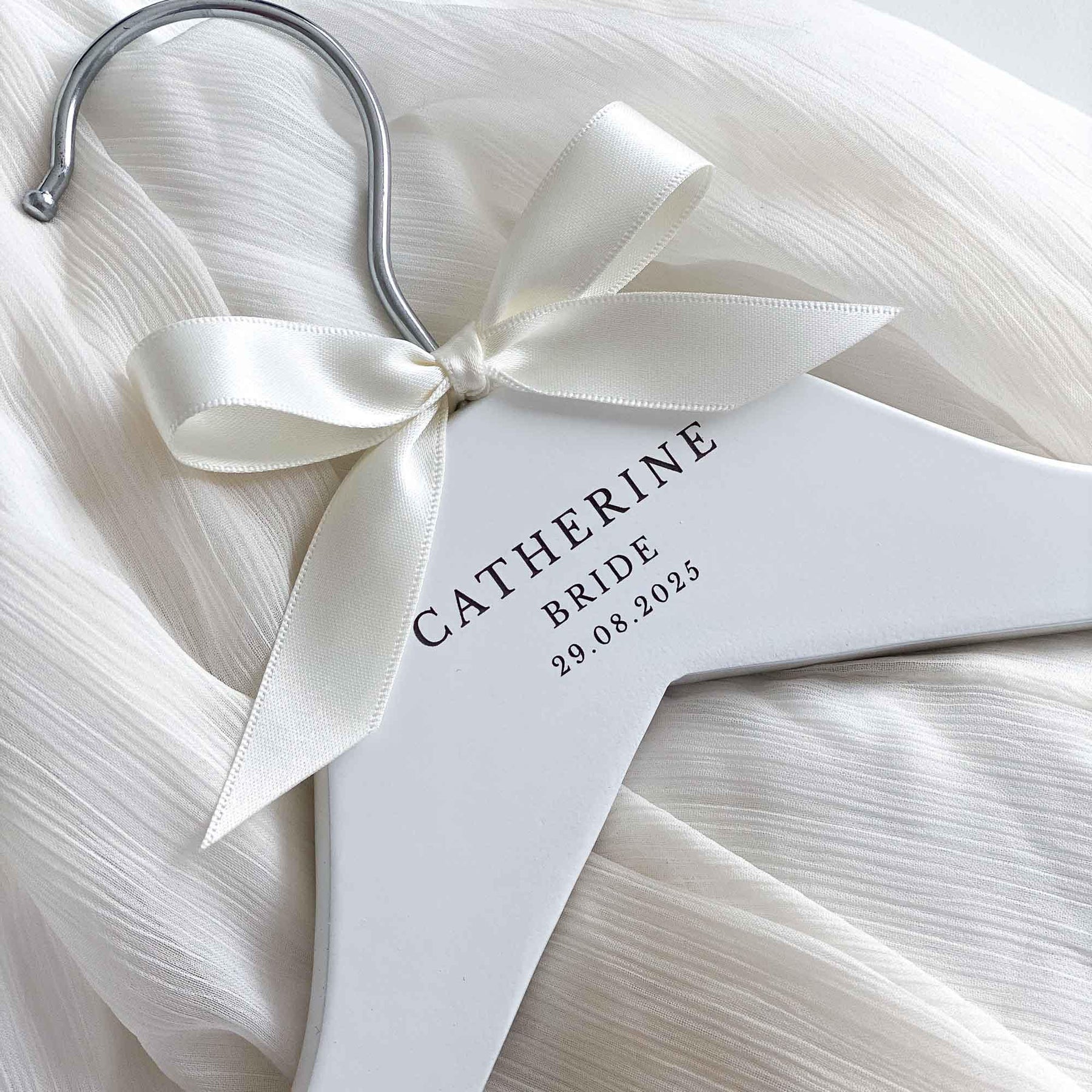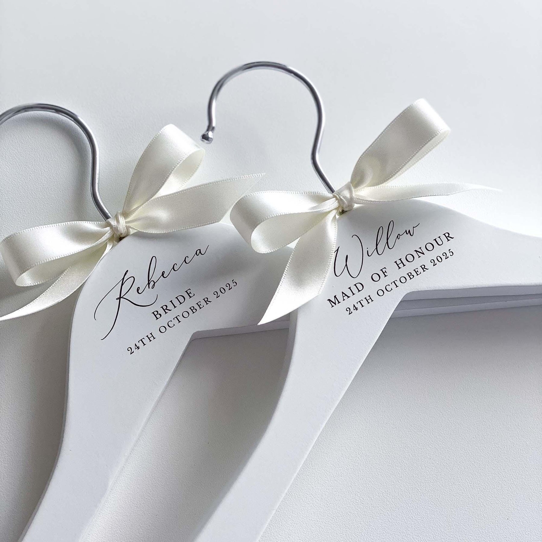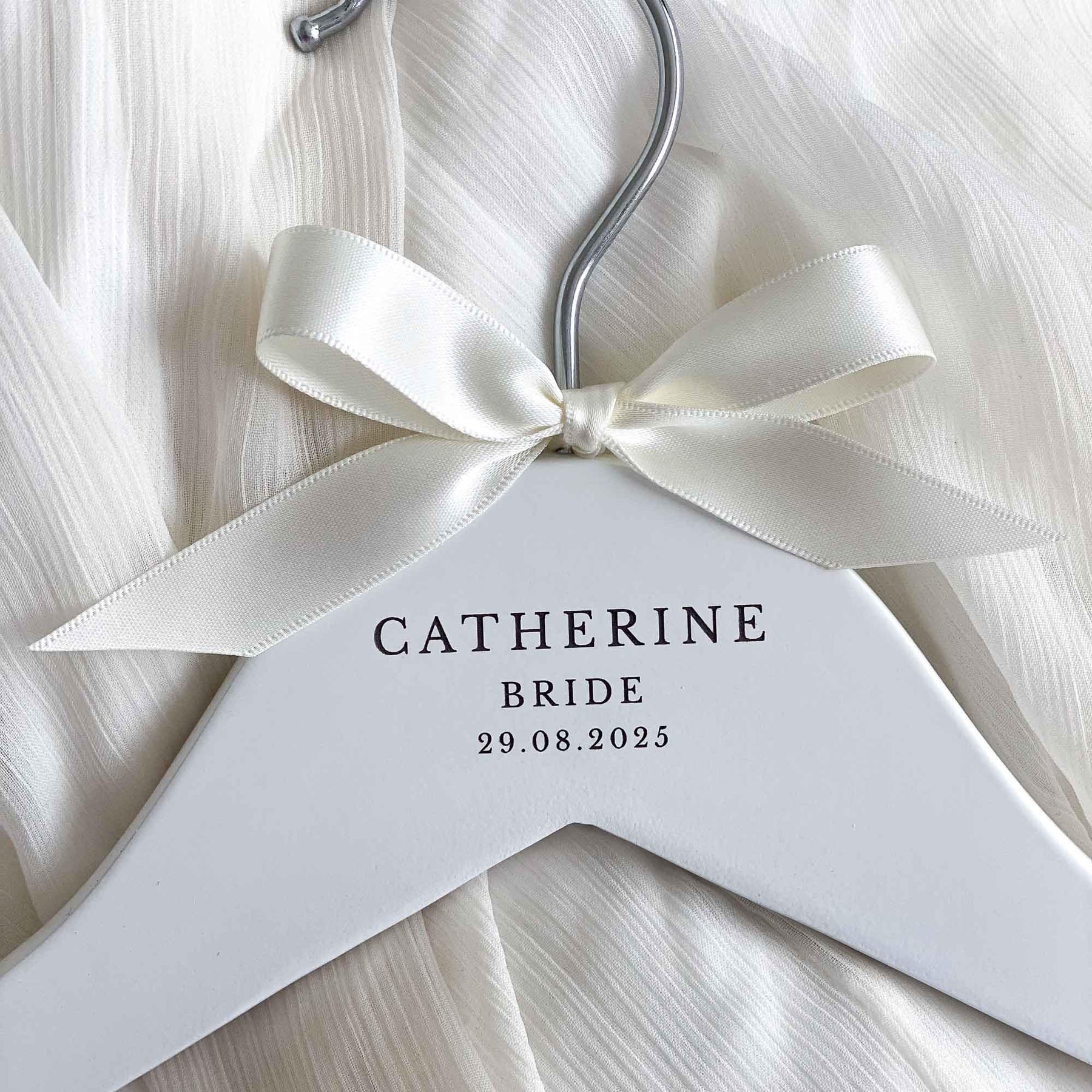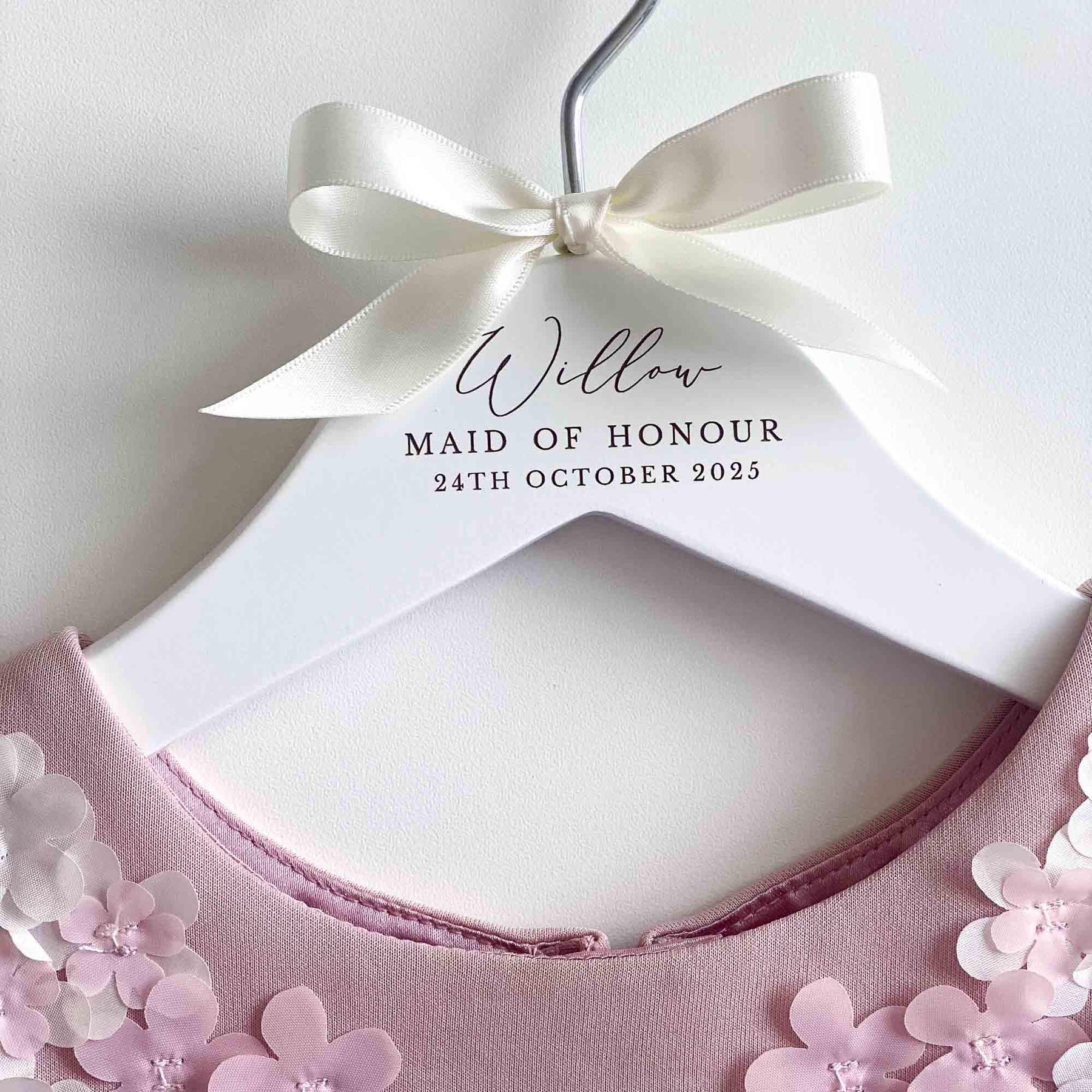 The hangers are hand-finished with a satin bow, adding a touch of sophistication and elegance. You can choose from a range of ribbon colours to suit your preferences and wedding theme. If your desired colour is not listed, simply select the "Other" option and specify your preferred colour in the personalisation or notes box.