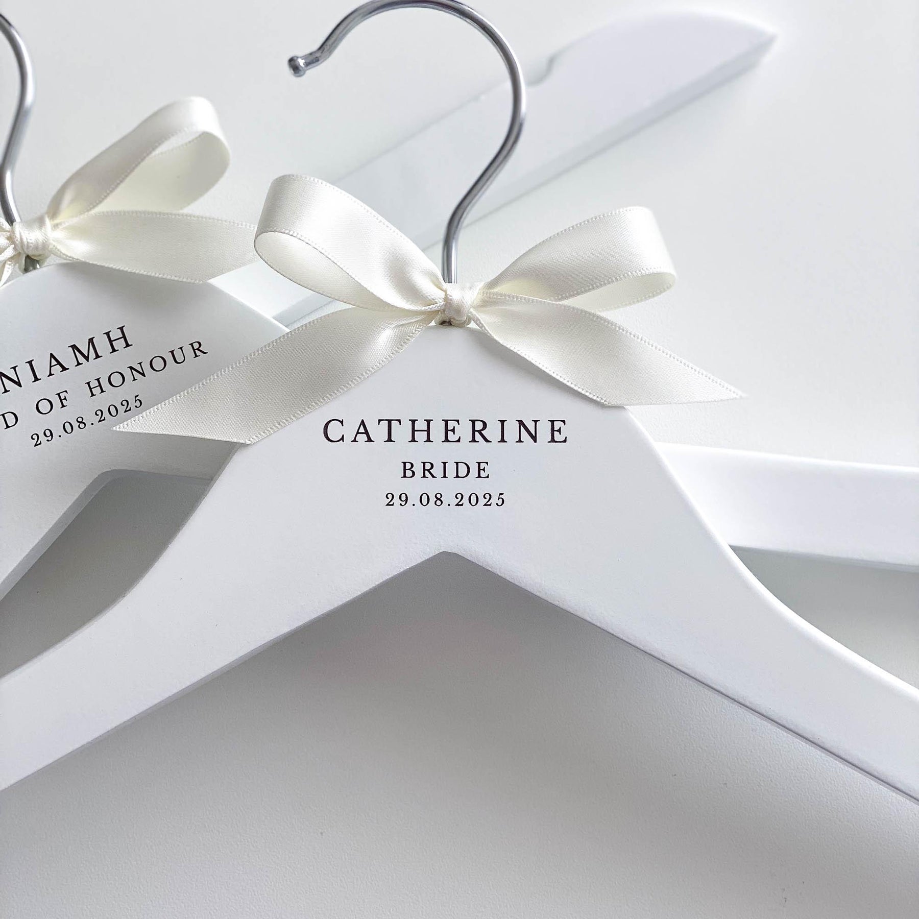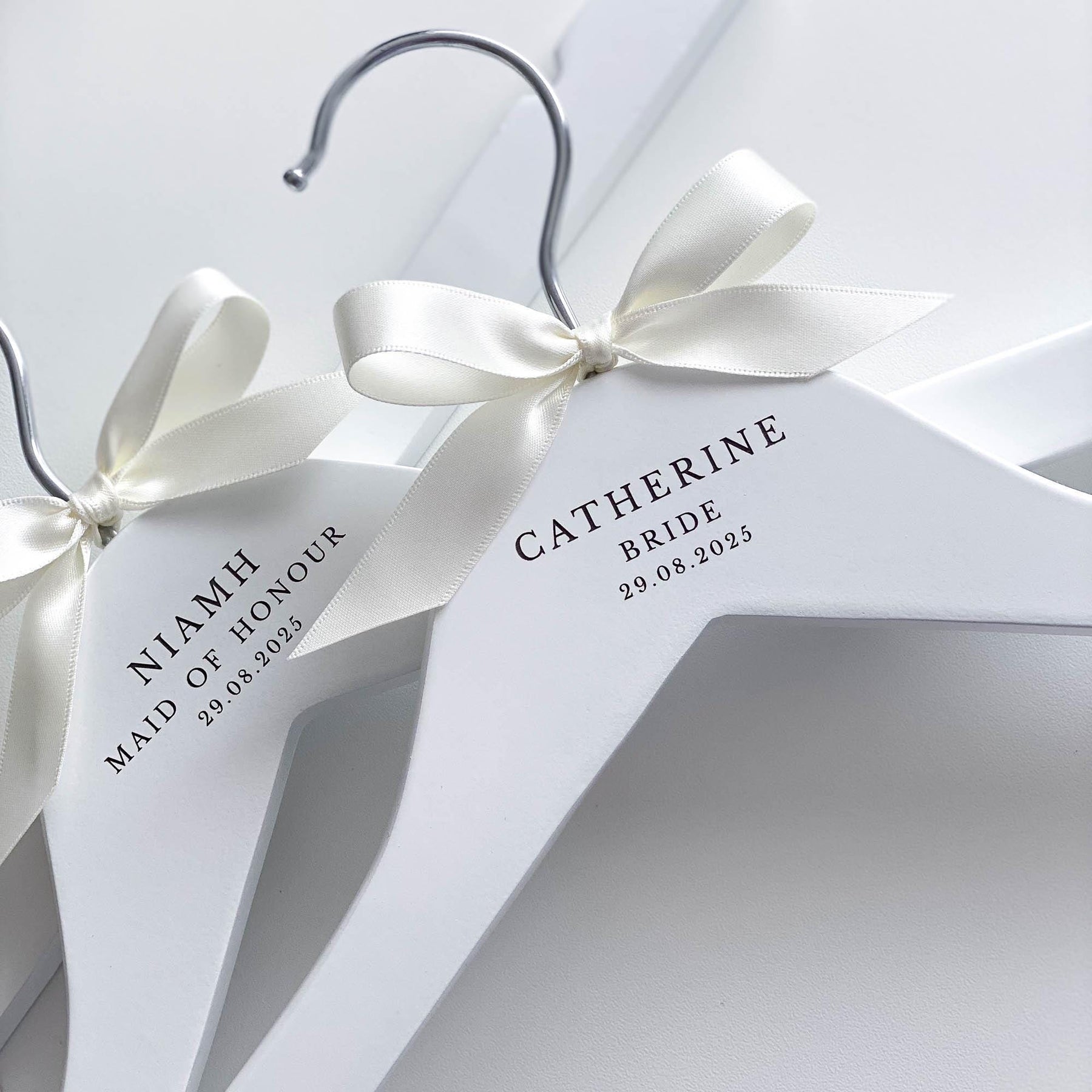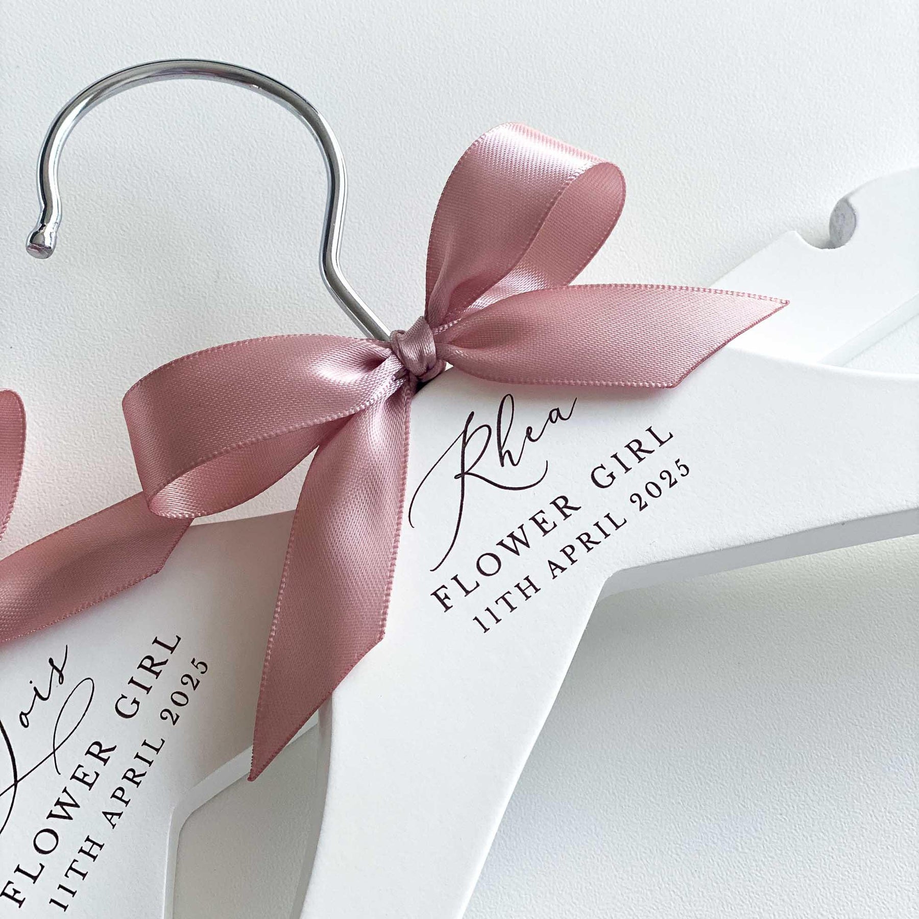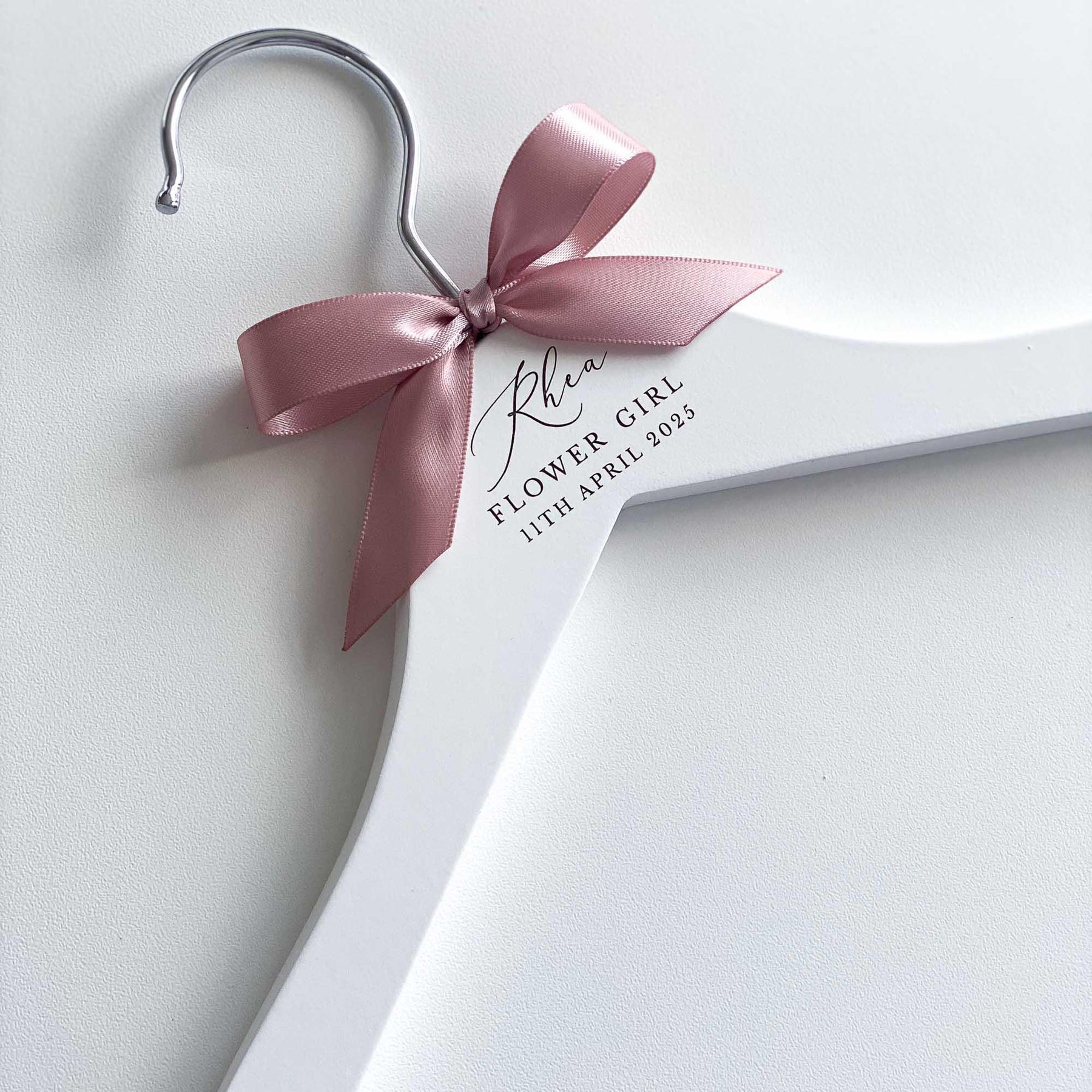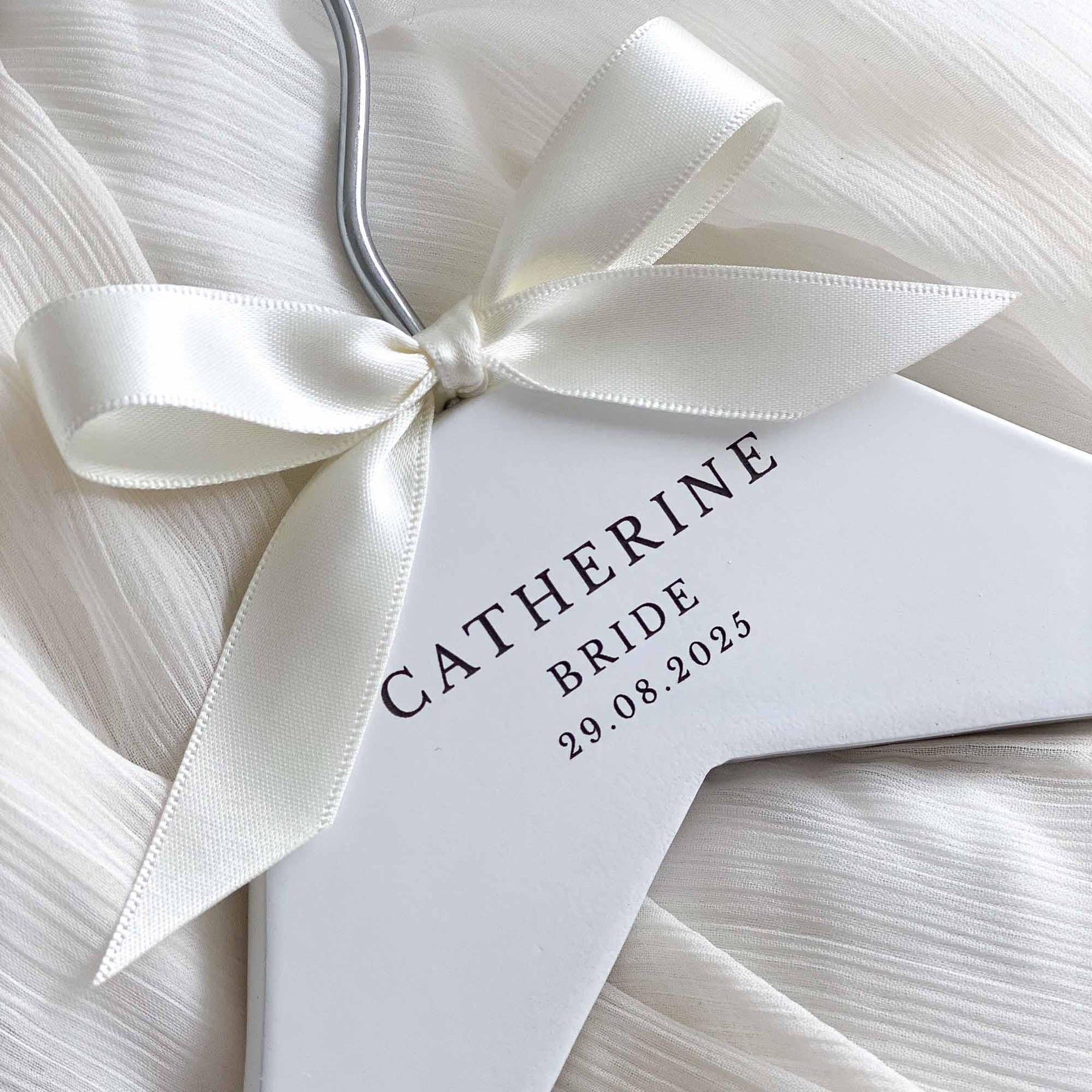 The hangers are hand-finished with a satin bow, adding a touch of sophistication and elegance. You can choose from a range of ribbon colours to suit your preferences and wedding theme. If your desired colour is not listed, simply select the "Other" option and specify your preferred colour in the personalisation or notes box.