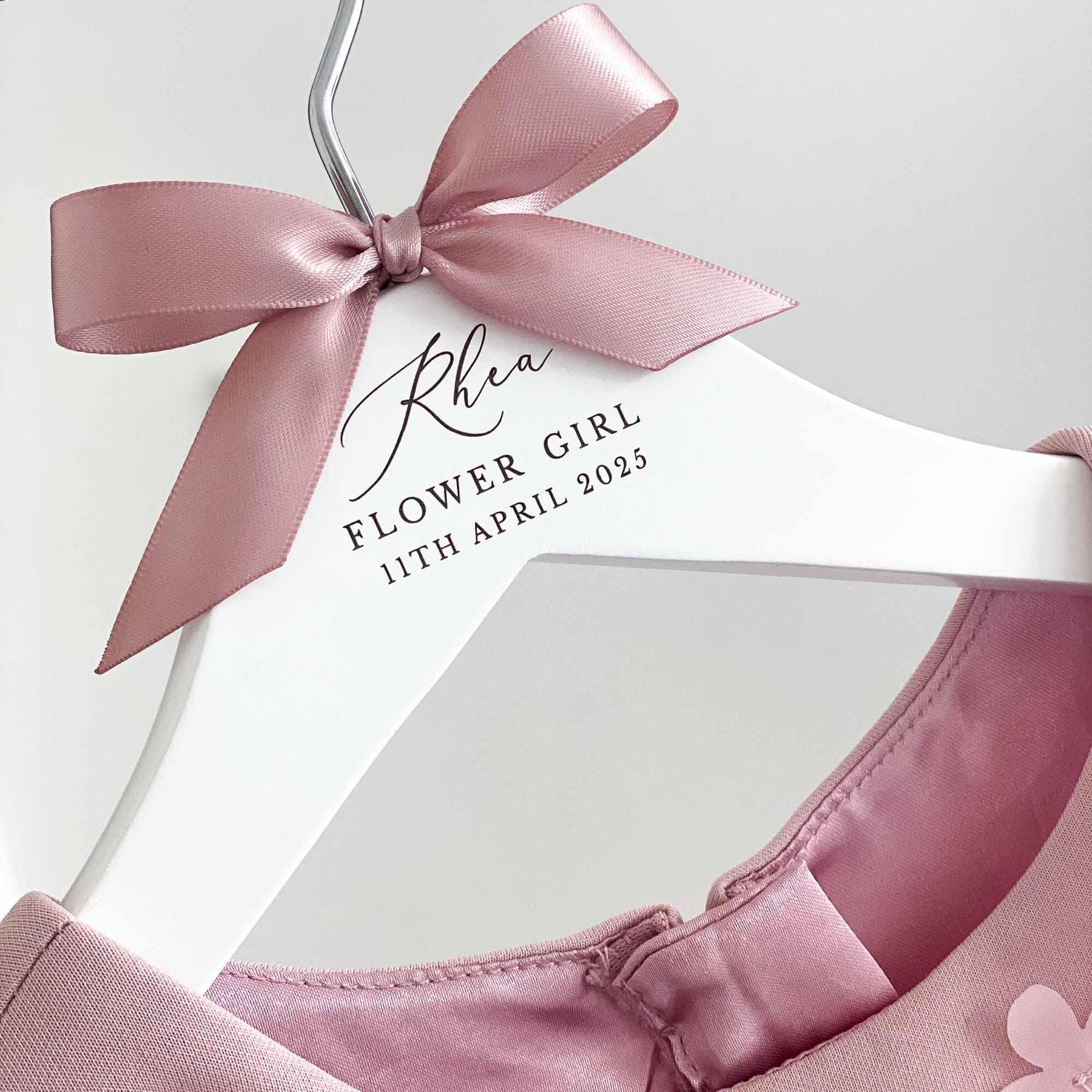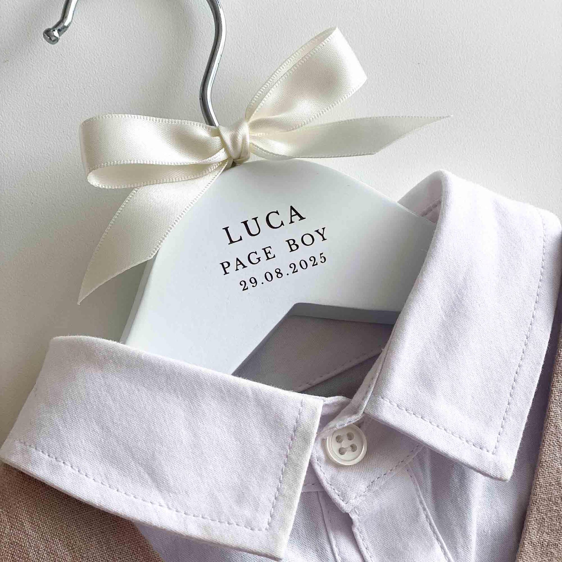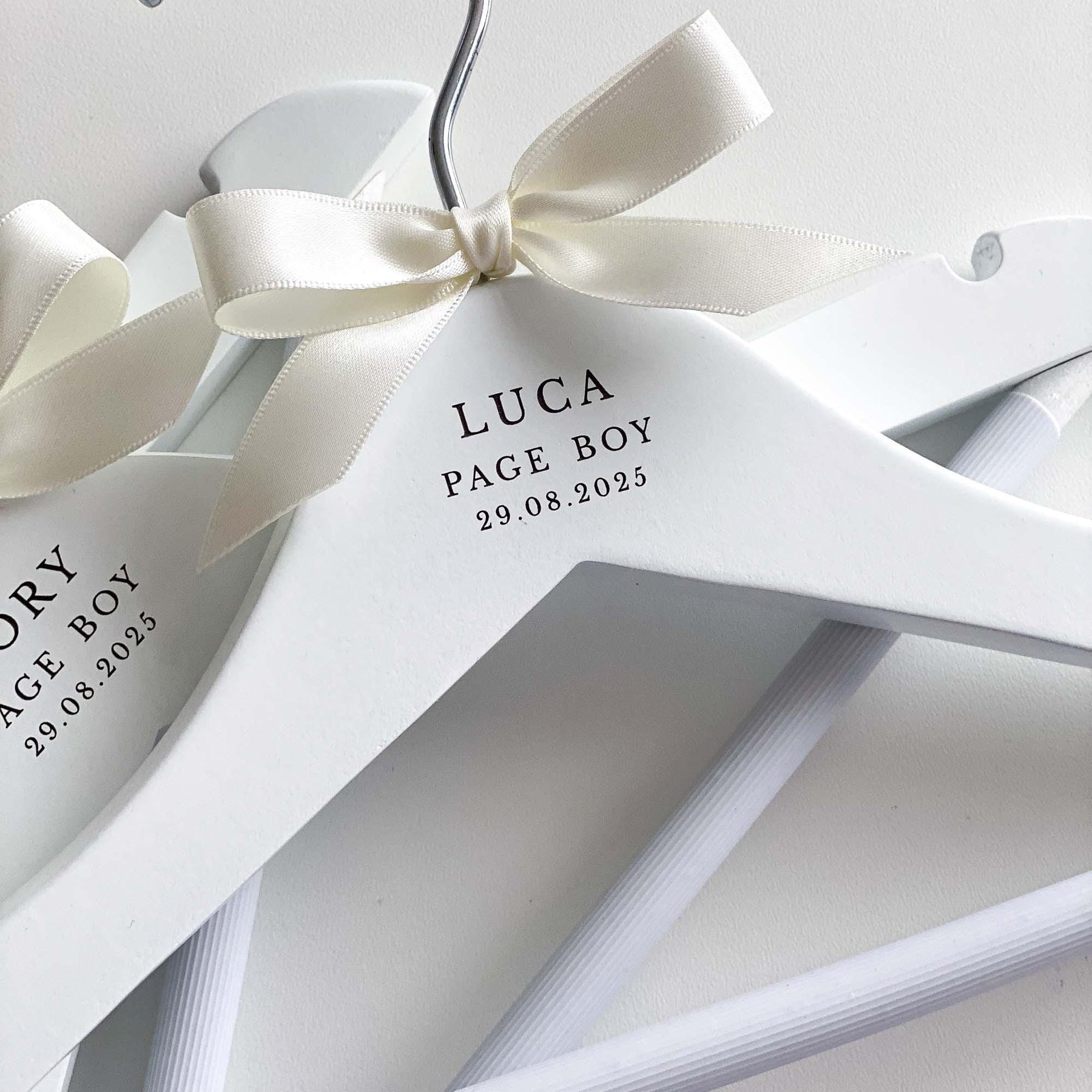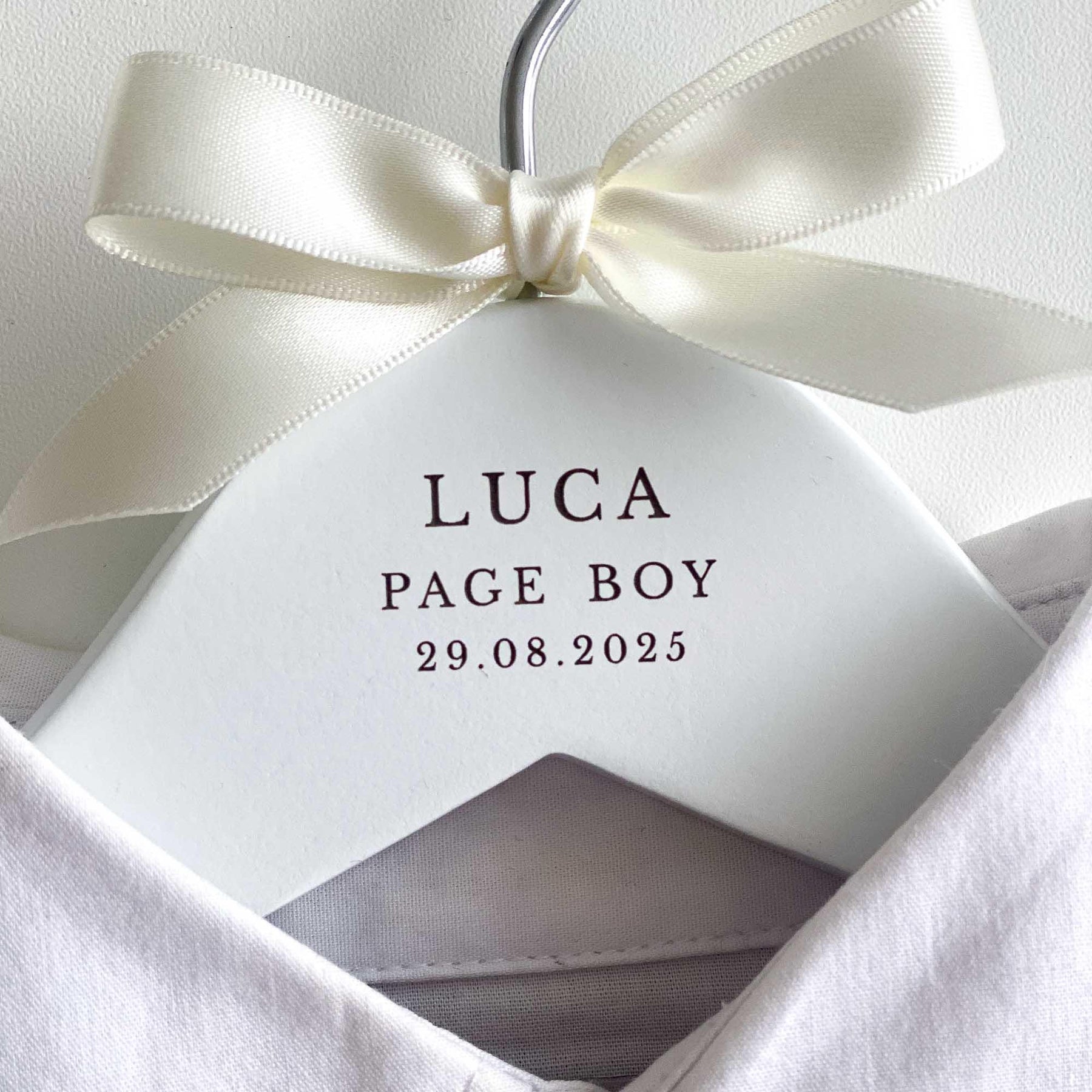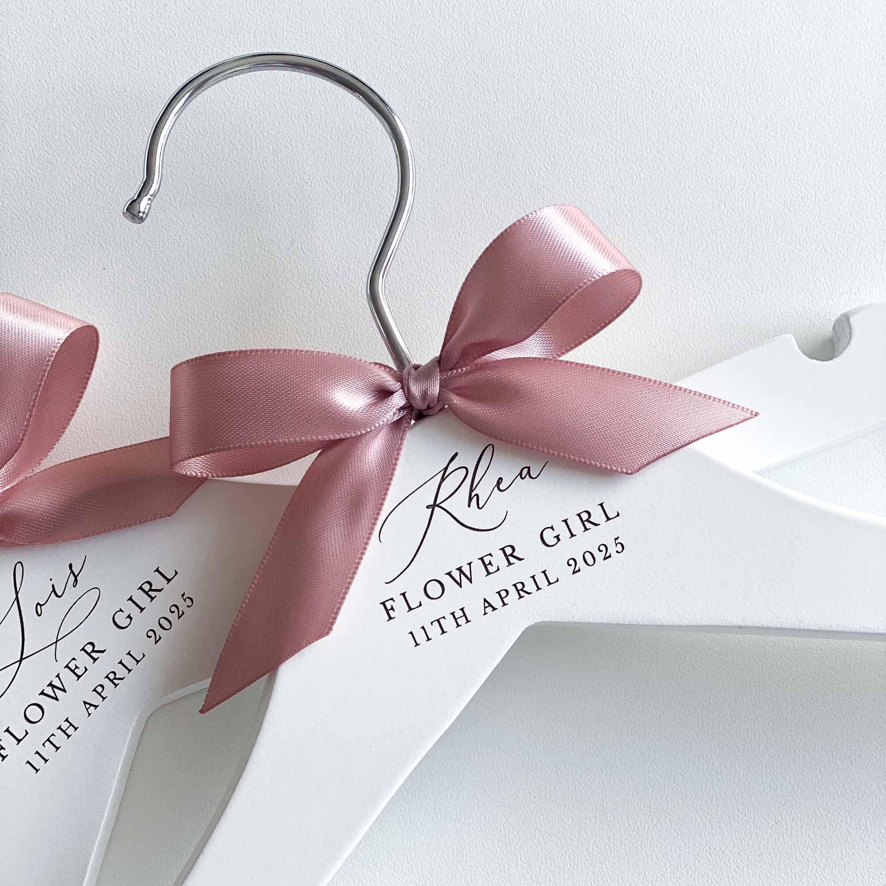 The hangers are hand-finished with a satin bow, adding a touch of sophistication and elegance. You can choose from a range of ribbon colours to suit your preferences and wedding theme. If your desired colour is not listed, simply select the "Other" option and specify your preferred colour in the personalisation or notes box.